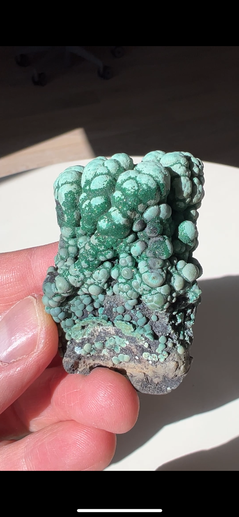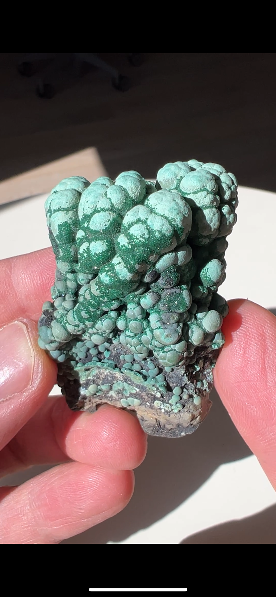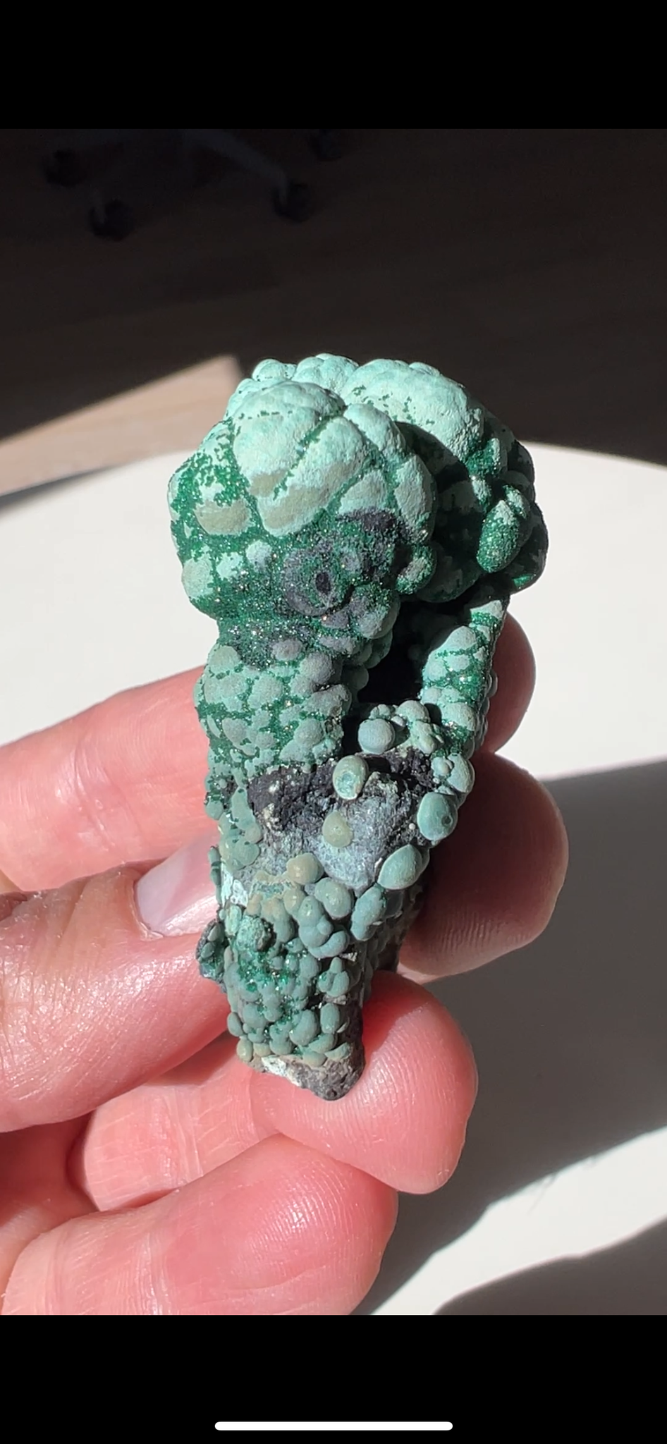 Rich, velvety green malachite in a natural botryoidal (grape-like) formation, displaying beautiful concentric patterns and shimmering luster. This piece has a lovely mix of deep and lighter green tones, with smooth, undulating surfaces that invite closer inspection. (ChatGPT)