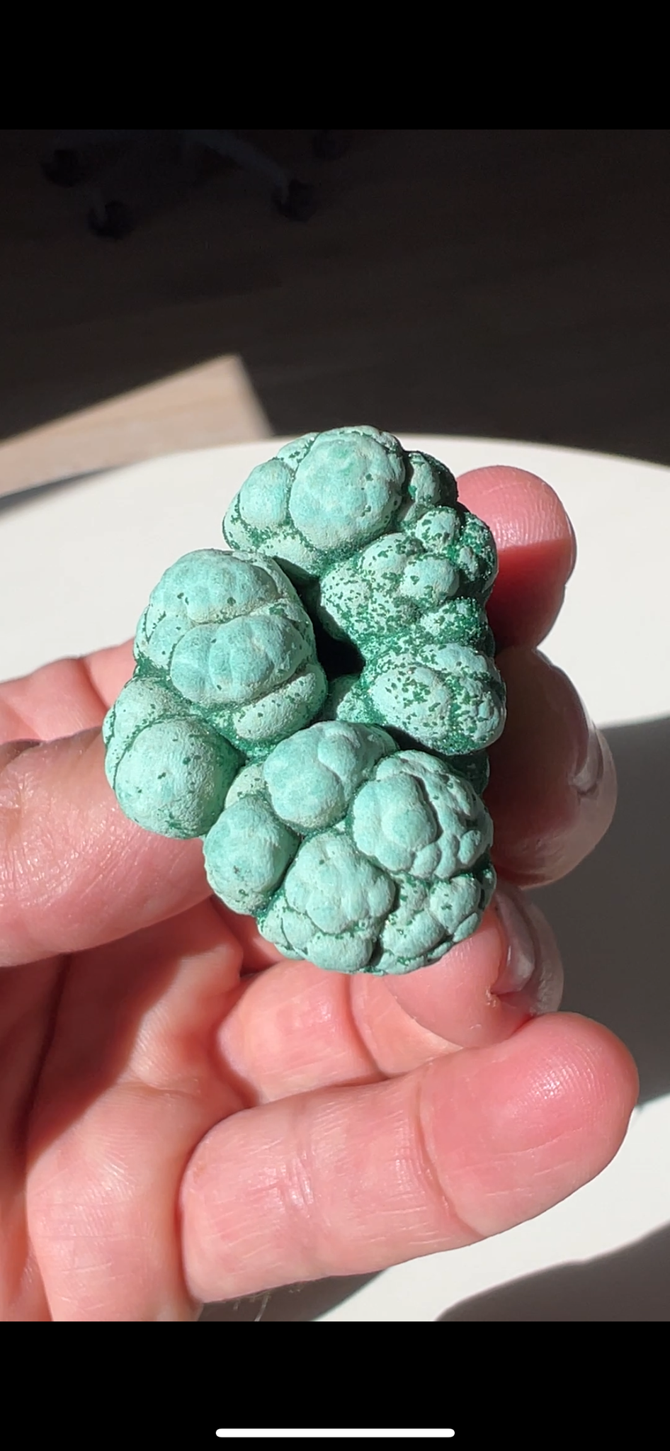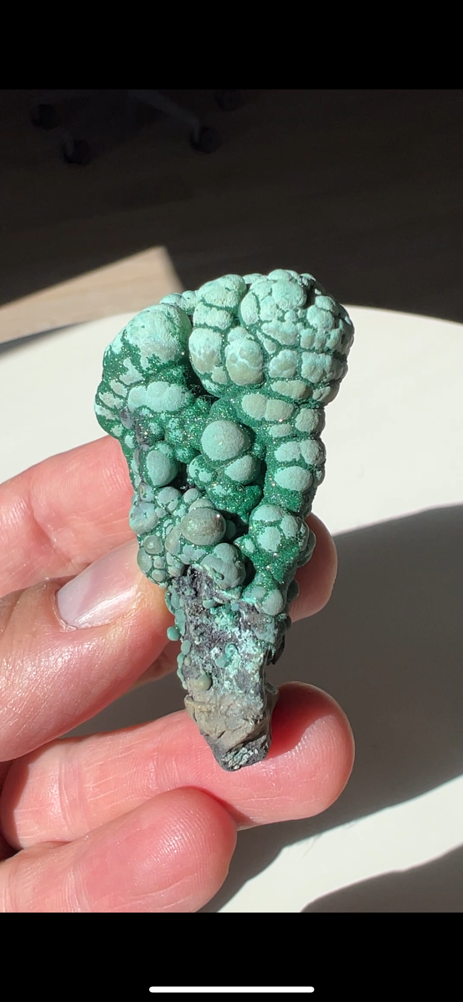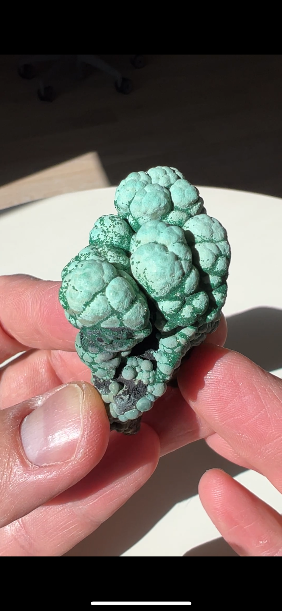 Rich, velvety green malachite in a natural botryoidal (grape-like) formation, displaying beautiful concentric patterns and shimmering luster. This piece has a lovely mix of deep and lighter green tones, with smooth, undulating surfaces that invite closer inspection. (ChatGPT)